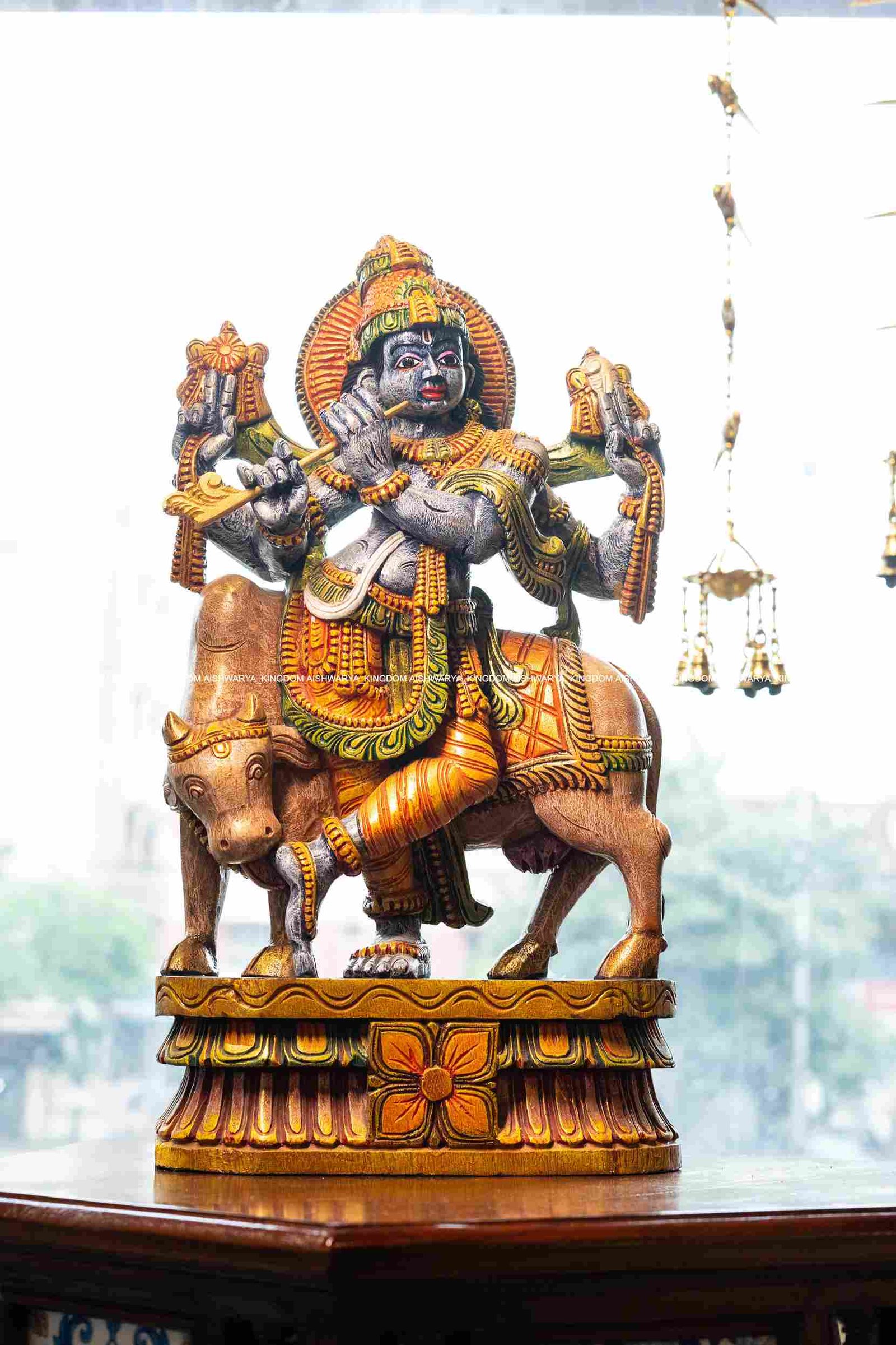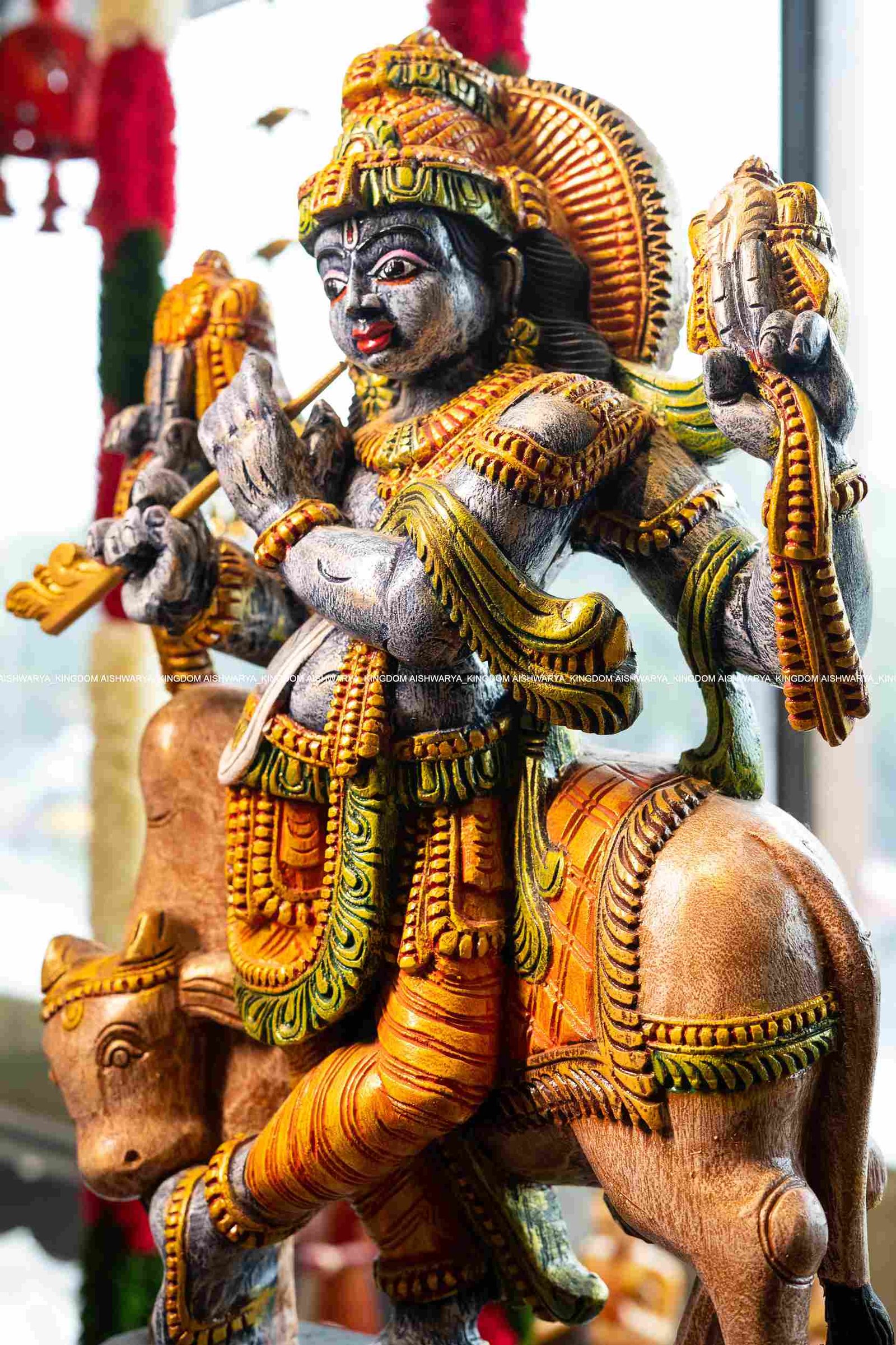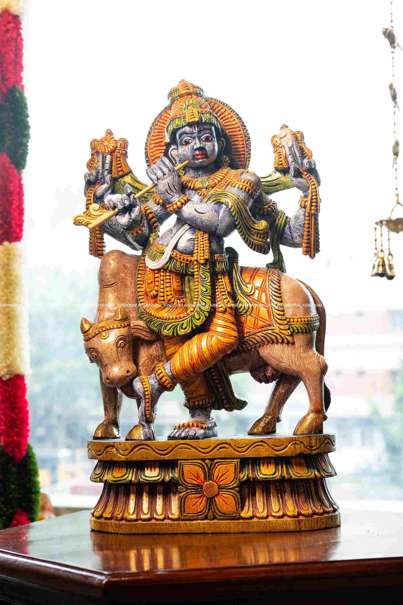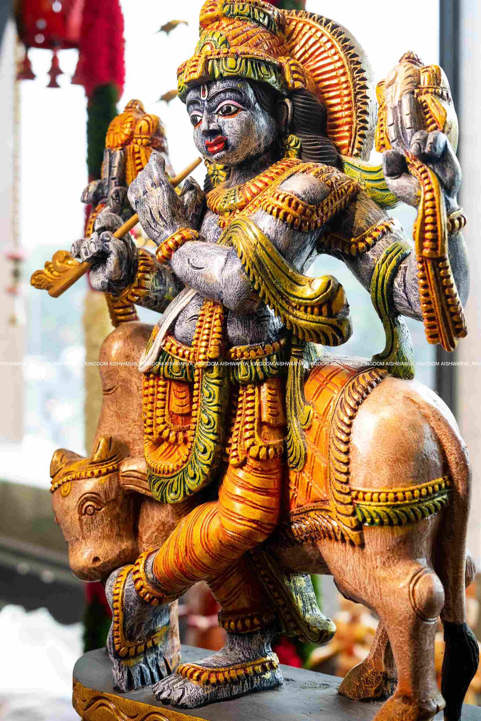 Artistry: The detailed carvings highlight Krishna’s playful demeanor and the gentle beauty of the cows, showcasing exceptional craftsmanship.